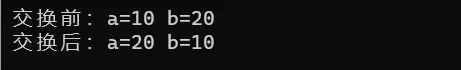 //代码1voidmy_exchange(inta, intb) { inttmp=a; //使用另外的一个变量先将a放进去,这时a就空了a=b; //然后将b放进ab=tmp; //再将放a的tmp放进b} //就可以实现交换intmain() { inta=10; intb=20; printf("交换前:a=%d b=%d\n", a, b); my_exchange(a, b); printf("交换后:a=%d b=%d\n", a, b); return0; }