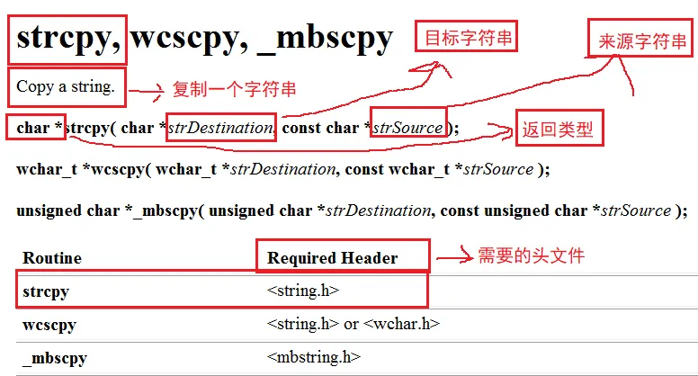 通过工具可以看到我们想了解的函数strcpy是一个拷贝字符串的函数,它的返回类型是一个char*的指针,所需要包含的头文件是<string.h>,作用将来源字符串复制至目标字符串