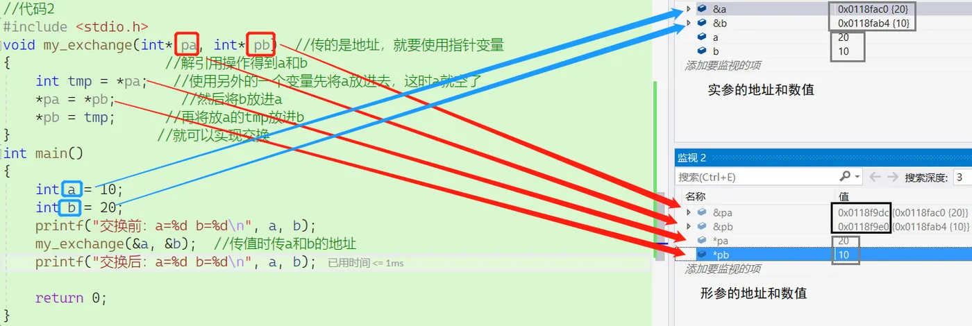 //代码2voidmy_exchange(int*pa, int*pb) //传的是地址,就要使用指针变量{ //解引用操作得到a和binttmp=*pa; //使用另外的一个变量先将a放进去,这时a就空了*pa=*pb; //然后将b放进a*pb=tmp; //再将放a的tmp放进b} //就可以实现交换intmain() { inta=10; intb=20; printf("交换前:a=%d b=%d\n", a, b); my_exchange(&a, &b); //传值时传a和b的地址printf("交换后:a=%d b=%d\n", a, b); return0; }