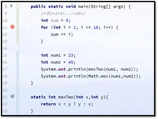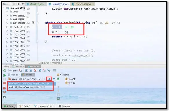 当已经运行于某个函数内,该按钮会亮起,点击后可返回到当前方法的调用处,重新执行。为便于理解,笔者在maxTwo(x,y)里面多写了两条代码,点击中间的正方形框时就会被跳入到最下方的方框中的main()函数中。