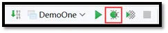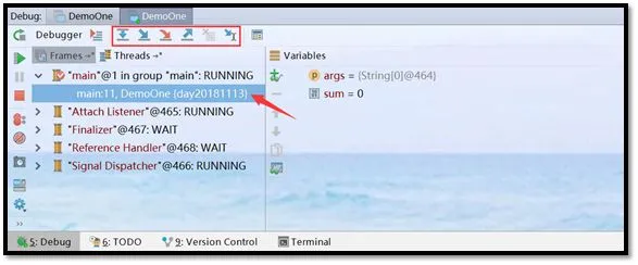 点击idea左上角的小虫子,进入调试,(注意左侧的下拉框选中应该为调试运行的程序,本人的程序名为DemoOne)。