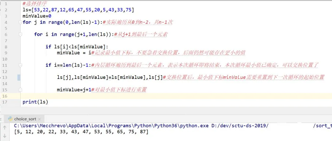 将本次遍历的第一个元素视为最小值,用mixValue记录其下标,遍历一次列表,只要存在比最小值小的数,便将当前下标赋值mixValue。本次遍历结束便交换最小值和遍历起始位的数。重复上述操作,每次遍历便将遍历起始位往后移一位,这样便能让数值小的数不断往前移。