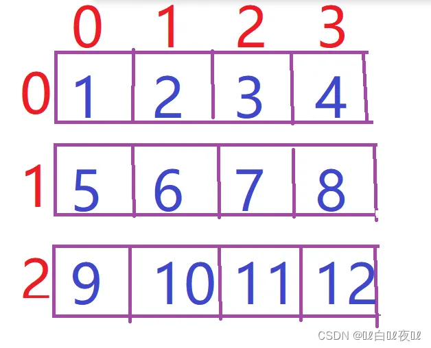 #include <stdio.h> int main() { int arr[3][4] = { 0 }; int i = 0; for (i = 0; i < 3; i++) { int j = 0; for (j = 0; j < 4; j++) { arr[i][j] = i * 4 + j;//给二维数组赋值 } } for (i = 0; i < 3; i++) { int j = 0; for (j = 0; j < 4; j++) { printf("%d ", arr[i][j]);//打印二维数组 } } return 0; }