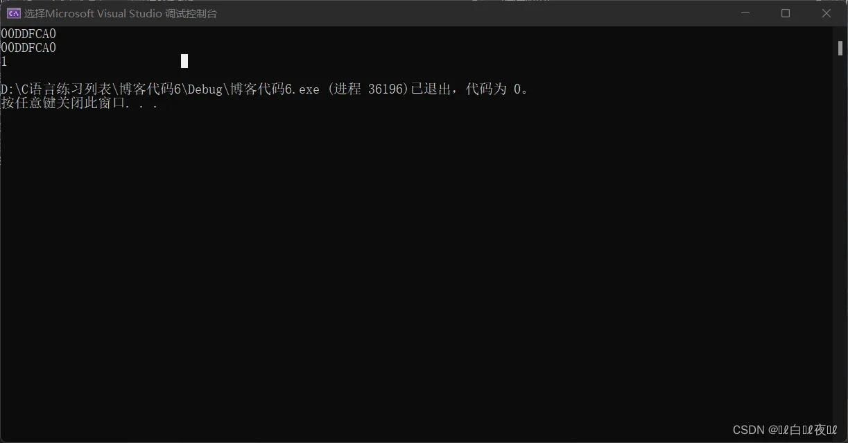第一个我们明明想打印的是第一行的元素,结果却打印了第二行的第一个元素,正常来说我们是访问了第一行的第五个元素,打印了6也代表着它们的排序向上面说的一样,是像三个一维数组排在了一起一样。