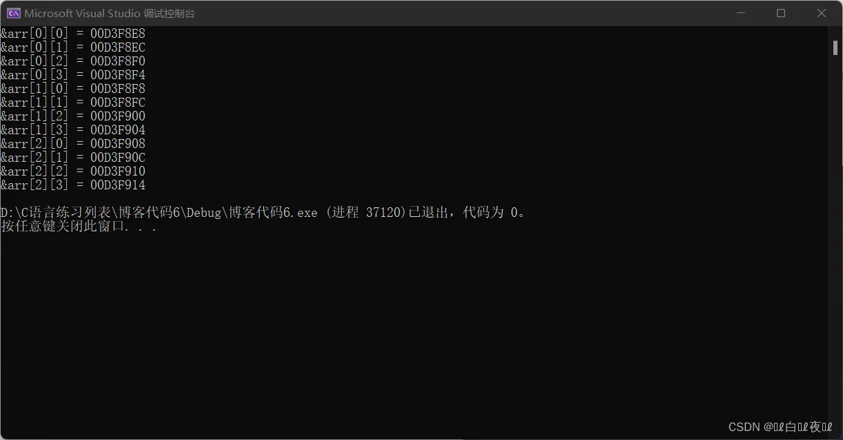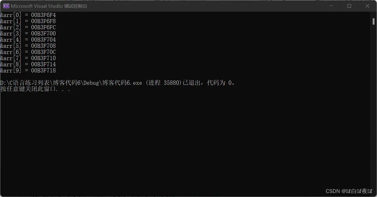 仔细观察输出的结果,我们知道,随着数组下标的增长,元素的地址,也在有规律的递增。
