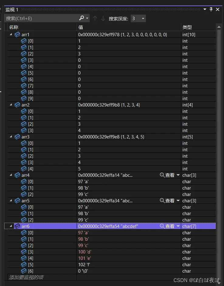 arr6这里显示了里面有7个元素,因为我们之前了解过,字符串的末尾都会有隐藏的\0这个字符,它也会占一个空间,所以在定义数组里面有多少元素的时候不要把隐藏的\0给忘记了!