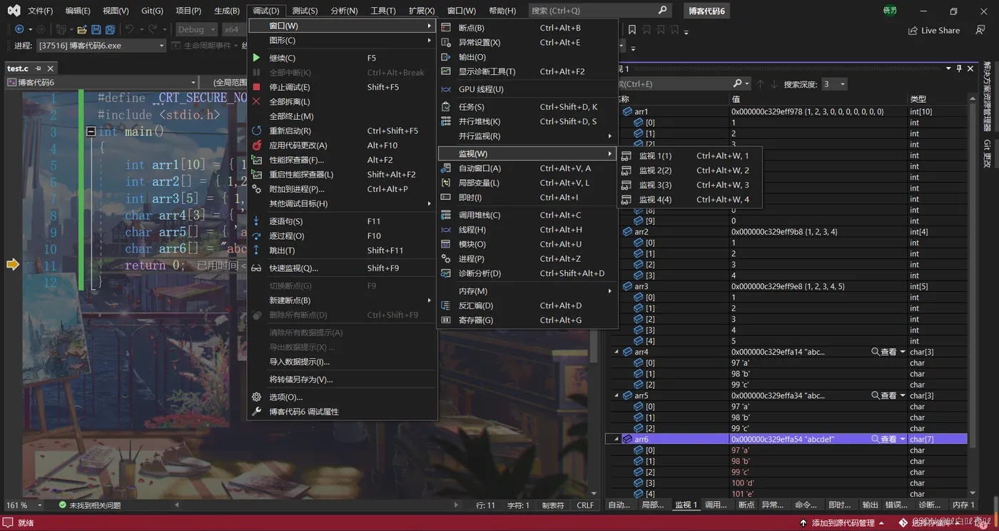 我们VS2022编译器是有调试的,先按一下F10,然后点击上面的调试,鼠标移动到窗口,然后有一个叫做监视的地方,移动到监视然后有监视窗口那个地方,点击它。