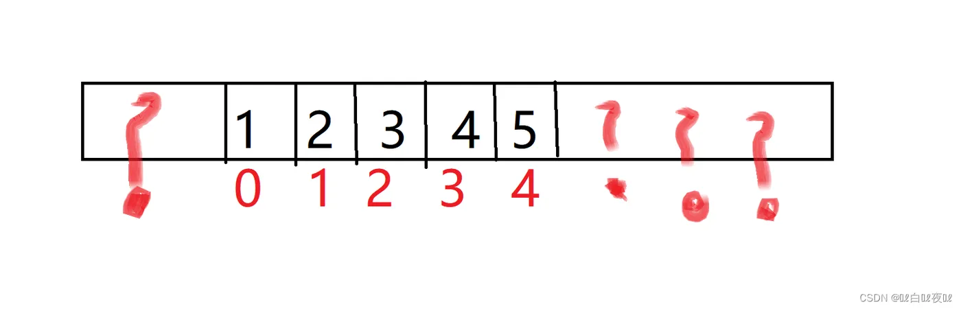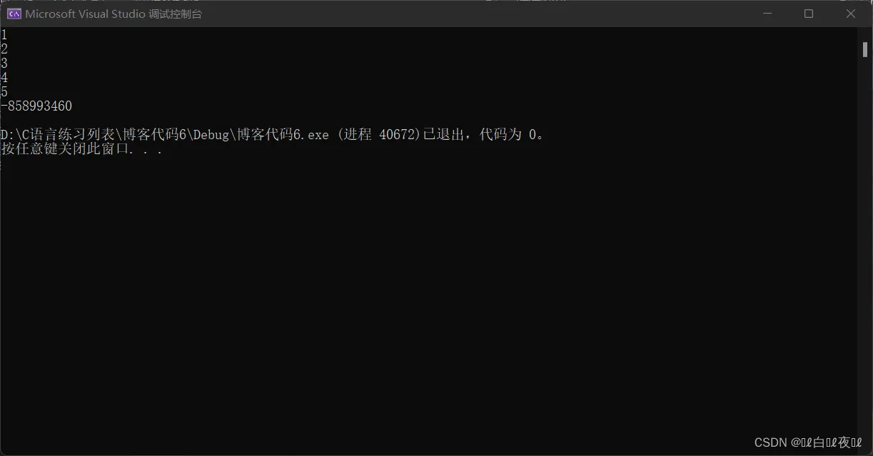 #include <stdio.h> int main() { int arr[5] = {1,2,3,4,5}; int i = 0; for(i=0; i<=5; i++) { printf("%d\n", arr[i]);//当i等于5的时候,越界访问了 } return 0; }