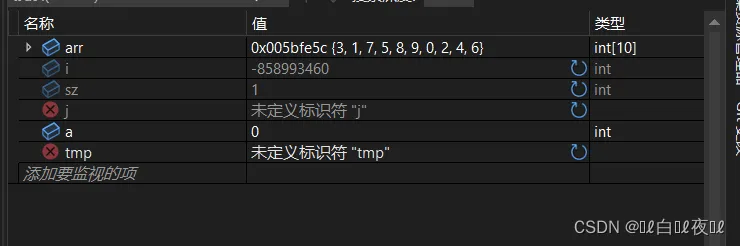 然后我们在添加监视的地方输入你要监视的数组名就可以了,我们监视这里所有的数组,看看它们内部储存了什么: