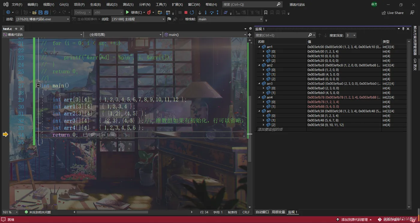arr3我们发现,它没有写列,这不要紧,我们有花括号,也就等于知道了有几行,所以是两行,四列,编译器会自己识别。