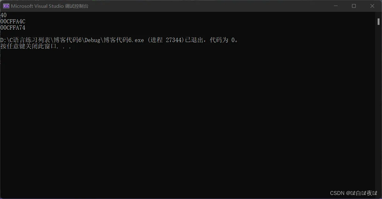 #include <stdio.h> int main() { int arr[10] = { 1,2,3,4,5,6,7,8,9,10 }; printf("%d\n", sizeof(arr)); printf("%p\n", &arr); printf("%p\n", &arr + 1); return 0; }