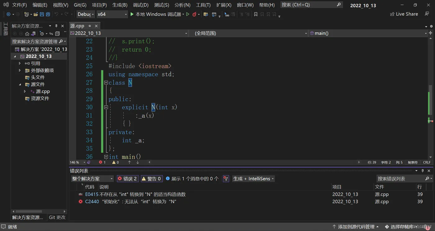 #include <iostream> using namespace std; class N { public: N(int x) :_a(x) { } private: int _a; }; int main() { N s1(2022); N s2 = 2022;//2022是一个整形,对象s2是一个自定义类,但是编译通过了 }