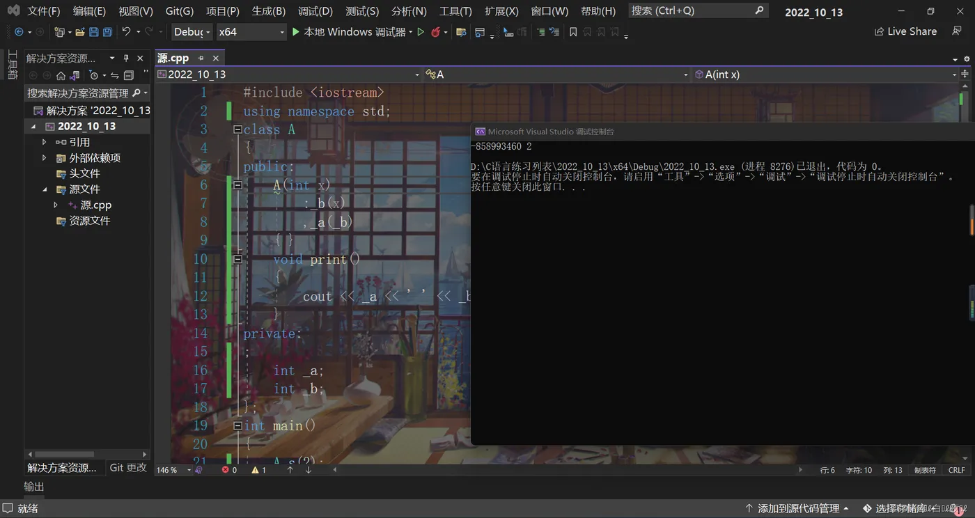 #include <iostream> using namespace std; class A { public: A(int x) :_b(x) ,_a(_b)//先初始化_a,这时的成员_b还没有初始化 { } void print() { cout << _a << ' ' << _b << endl; } private: ; int _a; int _b; }; int main() { A s(2); s.print(); return 0; }