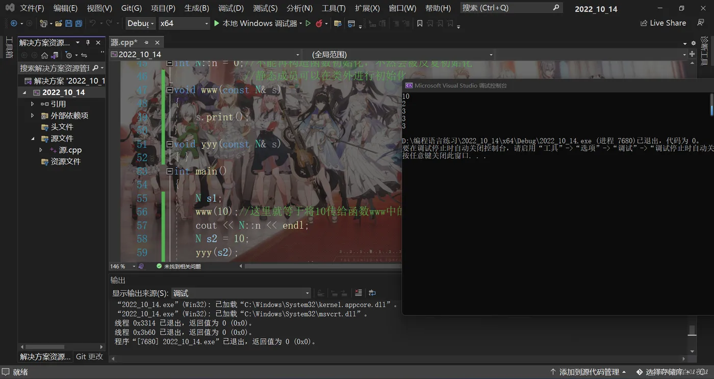 #include <iostream> using namespace std; class N { public: N(int x = 0) { _a = x; ++n; } void print()const { cout << _a << endl; } private: int _a; public: static int n; }; int N::n = 0;//不能再构造函数初始化,不然会被反复初始化 //静态成员可以在类外进行初始化 void www(const N& s) { s.print(); } void yyy(const N& s) { } int main() { N s1; www(10);//这里就等于将10传给函数www中的对象s cout << N::n << endl; N s2 = 10; yyy(s2); cout << N :: n << endl; //还有一些奇怪的访问方式 cout << s1.n << endl;//这里编译器会认为s1是N类,n在s1里面 N* p = nullptr; cout << p->n << endl;//这里虽然指向的是空指针,但是并没有解引用p,因为n在静态区 return 0; }