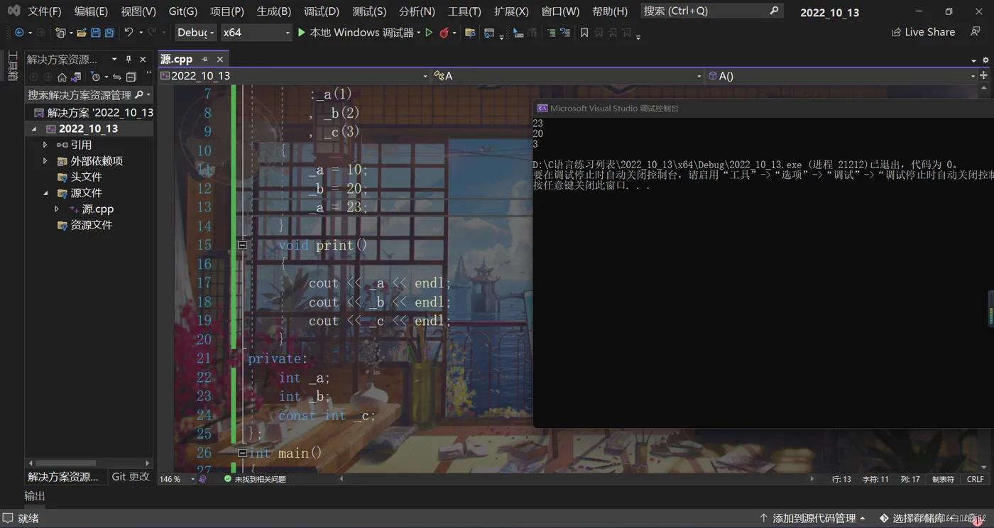 using namespace std; class A { public: A() :_a(1) , _b(2) , _c(3) { _a = 10; _b = 20; _a = 23; } void print() { cout << _a << endl; cout << _b << endl; cout << _c << endl; } private: int _a; int _b; const int _c; }; int main() { A s; s.print(); return 0; }