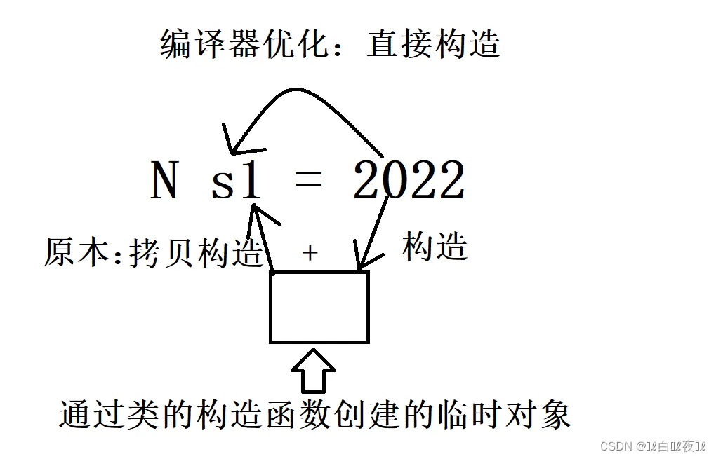 这里支持整形赋值到s2是因为构造函数中有一个单参的整形,也就是说相当于整形2022通过N类的构造函数创建了一个临时对象然后拷贝到了新创建的对象s2中,这里本来的步骤是构造+拷贝构造,但是编译器优化成了直接构造。