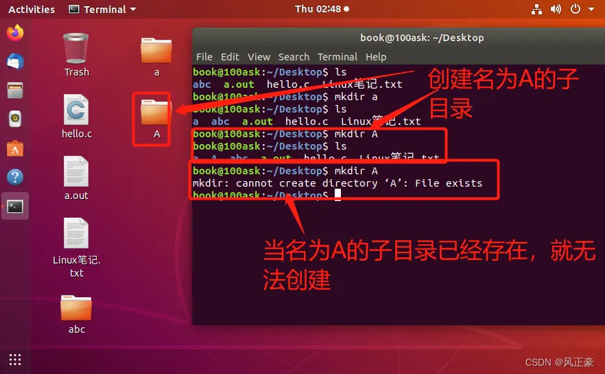 1, Linux是区分大小写的,所以目录A和目录a 是不同的。2,当相同名字的目录存在时,无法创建目录。