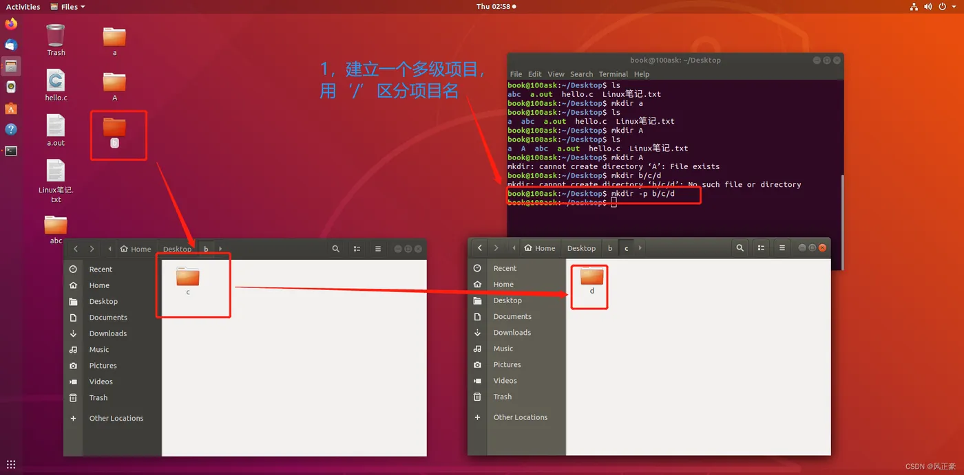这个时候有人会觉得,如果我想一次性建一个多级目录(目录b中有目录c,目录c中有目录d)怎么做呢?格式: mkdir -p 文件名/文件名/文件名;