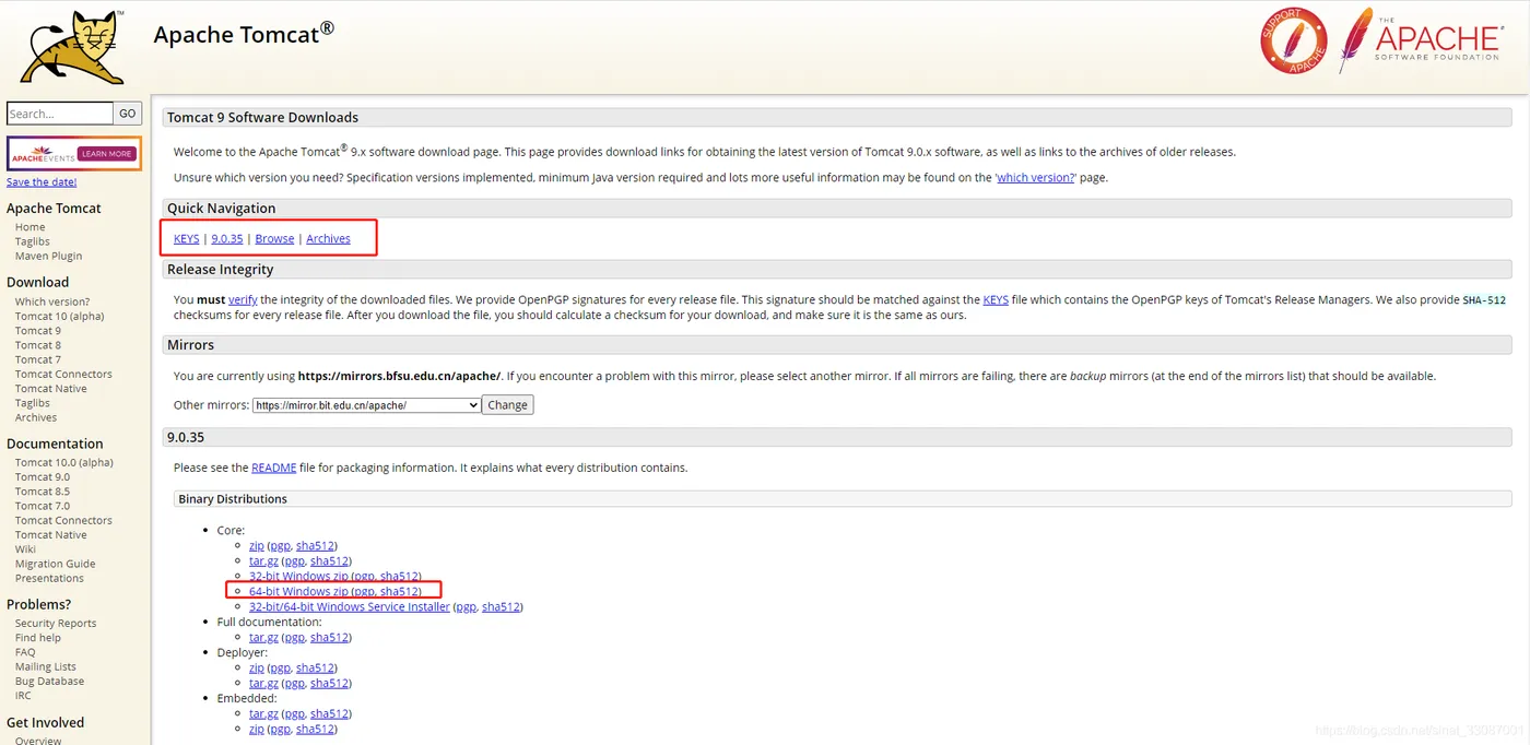 还记得两年前使用的版本是tomcat6,现在Apache基金会已经更新到tomcat10了,但是因为主流厂商目前仍在使用tomcat9的版本,所以为了避免之后出现不兼容的问题,我们仍然选择tomcat9,直接从官方网站下载即可Tomcat官网,下载时选择版本: