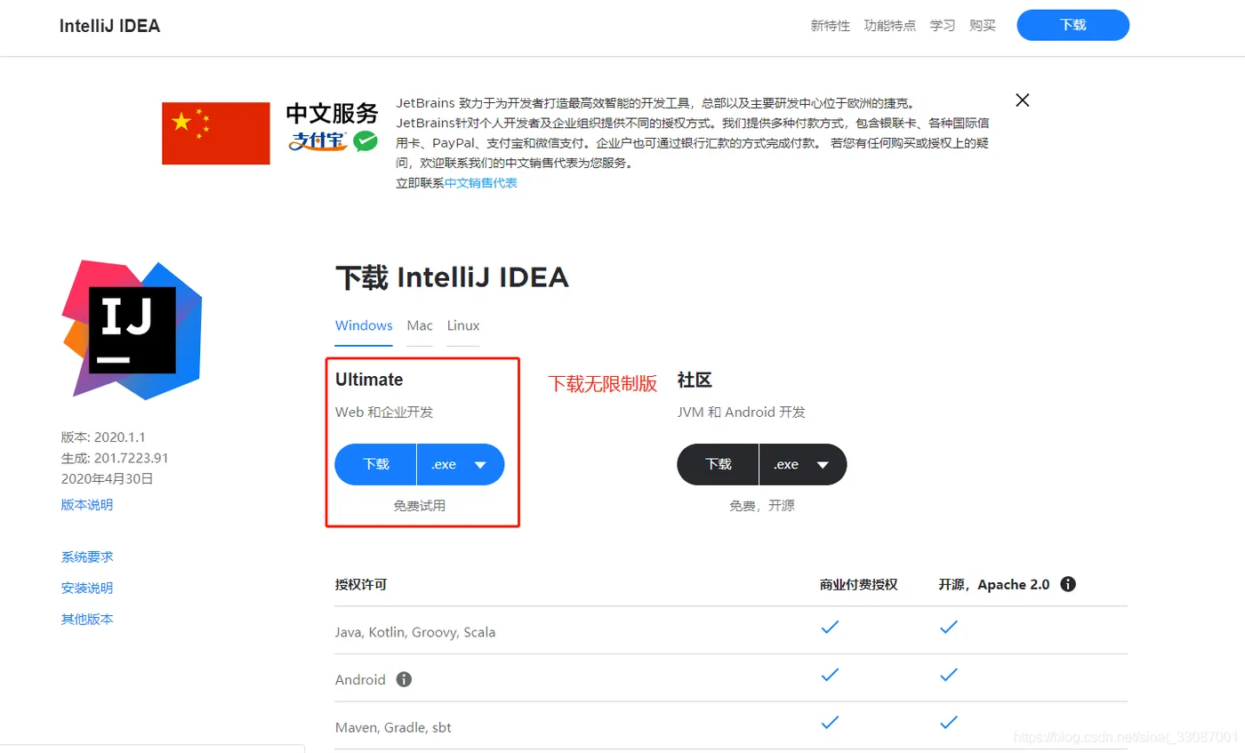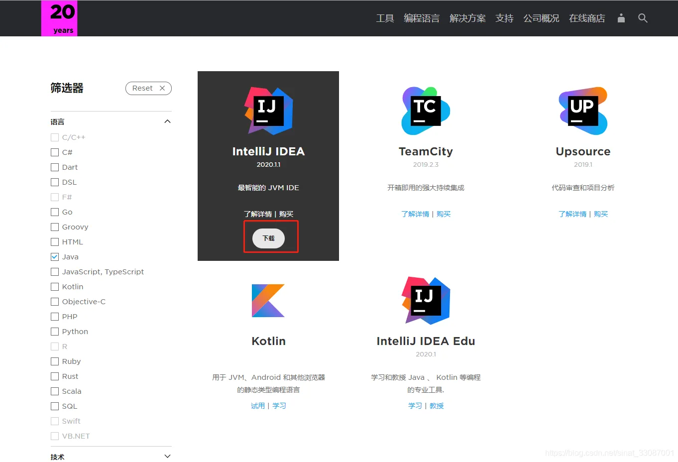 IDEA是JetBrain旗下的一款软件,没错,之前在VS里使用的Resharper也隶属于JetBrain旗下,直接点击JetBrain下载界面找到IDEA进行下载: