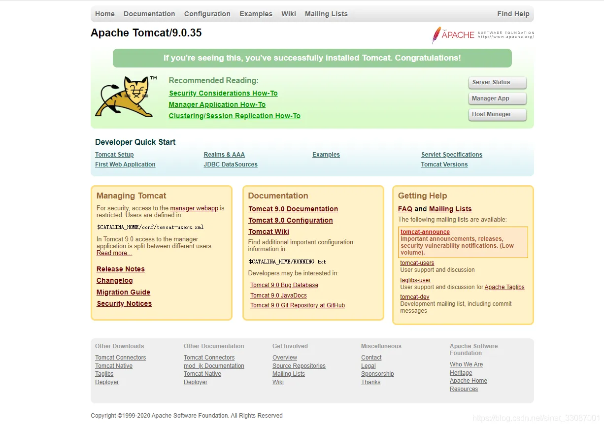 浏览器中输入网站:http://localhost:8080/,能看到以下界面即证明安装与配置正确: