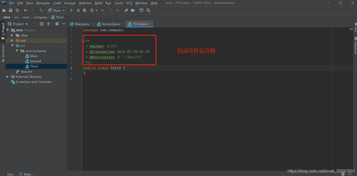 设置后效果如下,每次新建java文件的时候都会默认加好注释