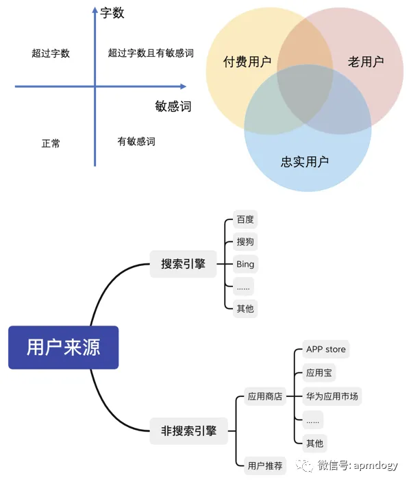 - 要符合MECE原则,即 Mutually Exclusive Collectively Exhaustive,“相互独立,完全穷尽”。我们在描述需求的时候,一定要考虑所有的情况,并给出应对方案。为了避免遗漏,最好借助坐标轴、集合关系图、脑图等方法。