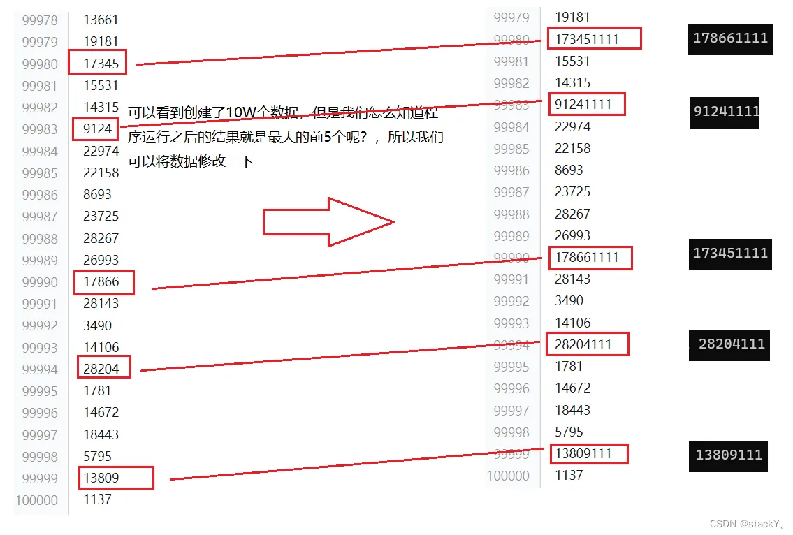 我们为了来演示代码的正确性,我们先来创建数据,将10W个数据先保存在一个文件中,然后找出这10W个数据中最大的前五个数据。这里就需要用到文件操作的相关知识(进阶C语言:文件操作)和一个随机数的种子(猜数字小游戏)。