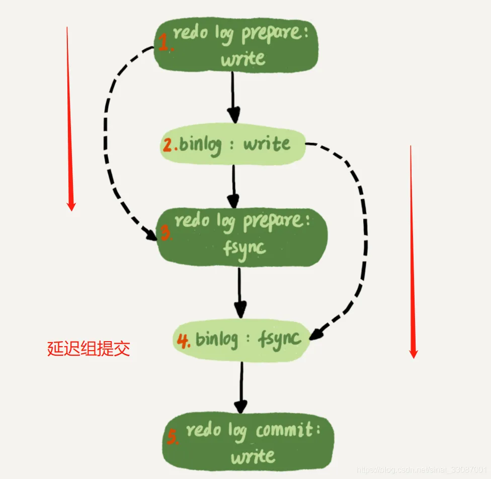 - redolog可以更好的组提交。把 redo log 做 fsync 的时间拖到了步骤 2之后,这样redo log做fsync 和 write的中间隔了一个binlog的write,所以会累计更多的事务在文件缓存中一起刷盘