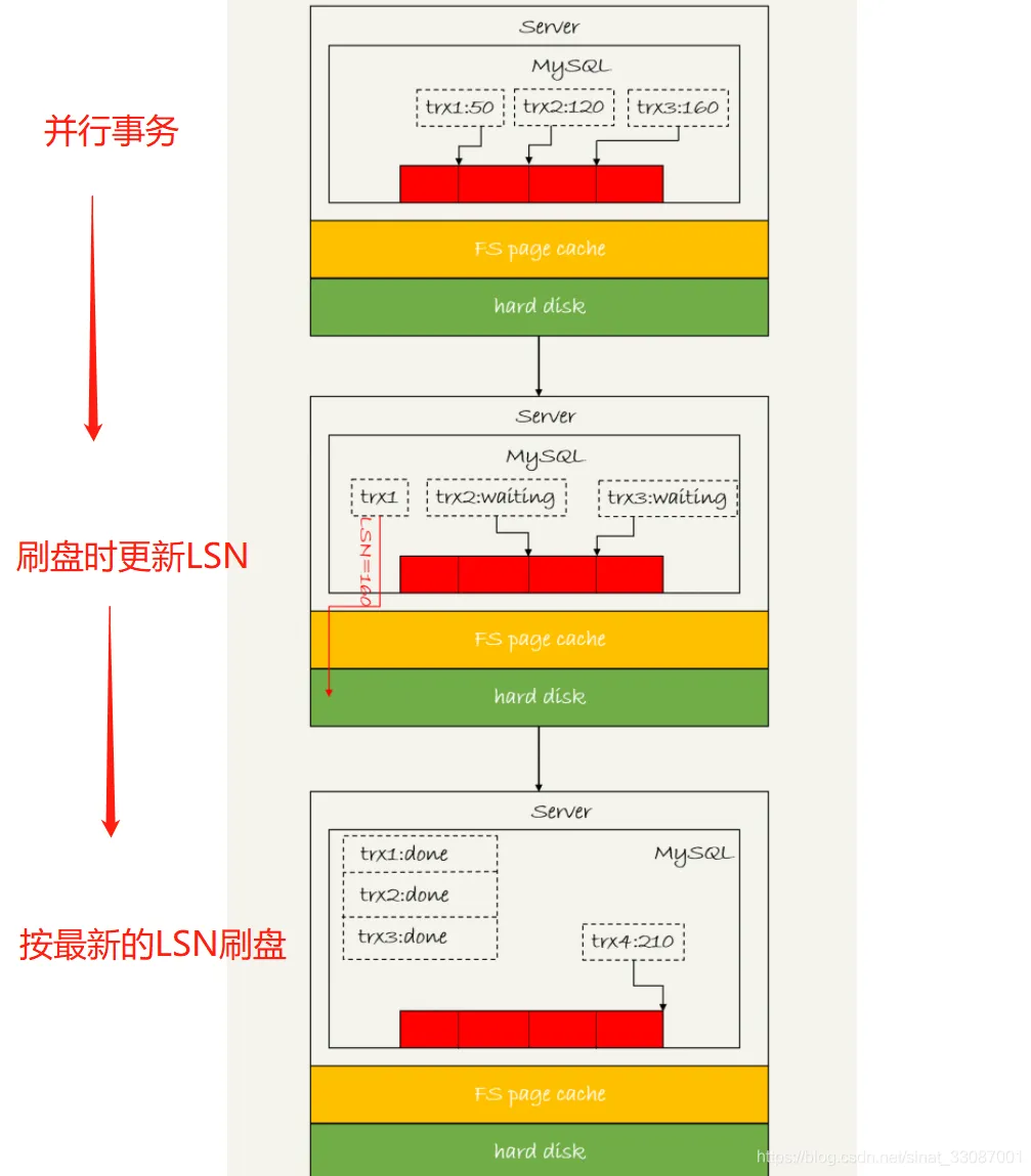 - 等 trx1 要开始写盘的时候,这个组里面已经有了三个事务,这时候 LSN 也变成了 160;
