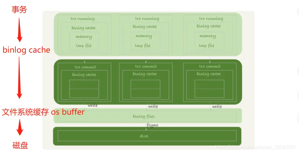 - 持久化到磁盘,对应的是 hard disk,也就是图中的绿色部分【binlog file on disk】,fsync到磁盘的速度就慢多了