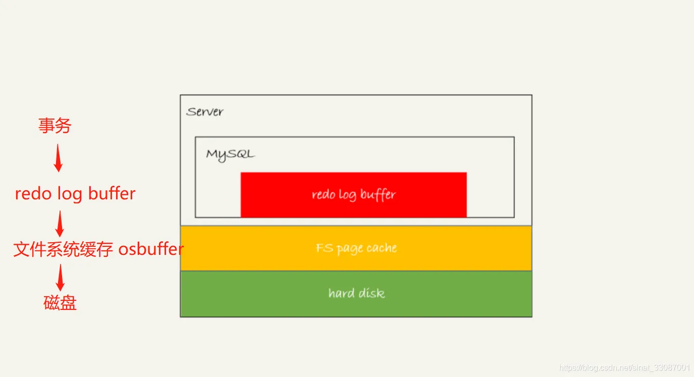 InnoDB 有一个后台线程,每隔 1 秒,就会把 redo log buffer 中的日志,调用 write 写到文件系统的 page cache,然后调用 fsync 持久化到磁盘。可以理解为innodb_flush_log_at_trx_commit三个设置对应每次事务写入到不同级别,而每隔一秒就会从最不稳定状态直接刷到最稳定状态