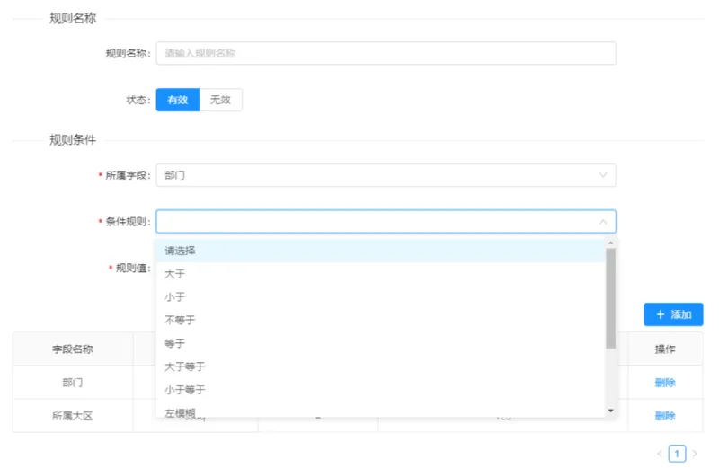 规则字段配置说明: 条件表达式:大于/大于等于/小于/小于等于/等于/包含/模糊/不等于 规则值:指定值 ( 固定值/系统上下文变量 )