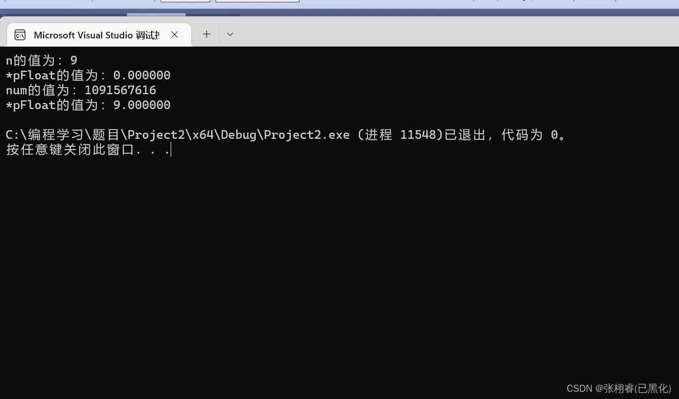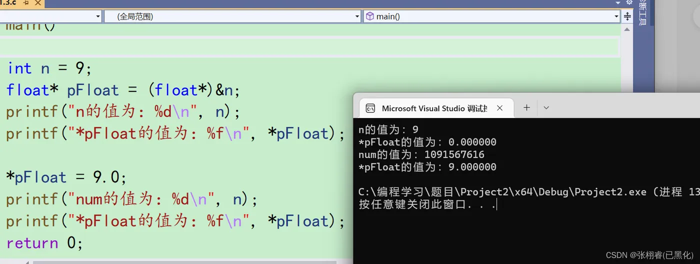 #include<stdio.h> int main() { int n = 9; float* pFloat = (float*)&n; printf("n的值为:%d\n", n); printf("*pFloat的值为:%f\n", *pFloat); *pFloat = 9.0; printf("num的值为:%d\n", n); printf("*pFloat的值为:%f\n", *pFloat); return 0; }