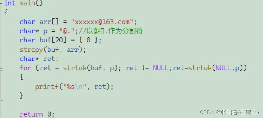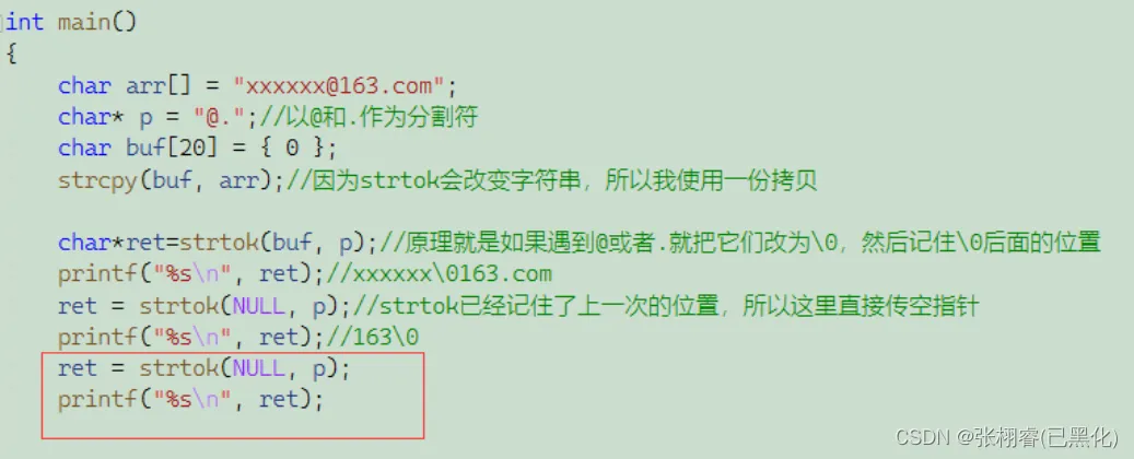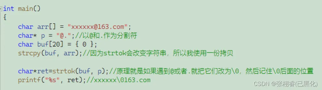 2.strtok函数找到str中的下一个标记,并将其用 \0 结尾,返回一个指向这个标记的指针。(注:strtok函数会改变被操作的字符串,所以在使用strtok函数切分的字符串一般都是临时拷贝的内容并且可修改。)