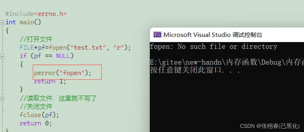 int main() { //打开文件 FILE* pf = fopen("test.c", "r"); if (pf == NULL) { printf("%s\n", strerror(errno));//需要包含头文件#include<errno.h> return 1; } //读文件 //关闭文件 fclose(pf); return 0; } //打开失败时屏幕显示: No such file or directory
