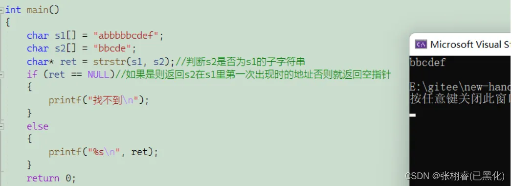 char* my_strstr(const char* str1, const char* str2) { assert(str1 && str2); if (*str2 == '\0') { return (char*)str1; } const char* s1 = NULL; const char* s2 = NULL; const char* cp = str1; while (*cp) { s1 = cp; s2 = str2; while (*s1 !='\0' && *s2!='\0' && *s1 == *s2) { s1++; s2++; } if (*s2 == '\0') { return (char*)cp; } cp++; } return NULL; }