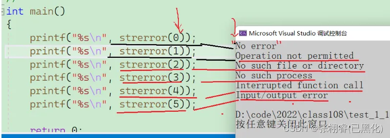 关于这里的errno,C语言的库函数在运行的时候,如果发生错误,就会将错误码存在一个变量中,这个变量是:errno,错误码是一些数字:1 2 3 4 5,我们需要讲错误码翻译成错误消息。