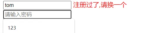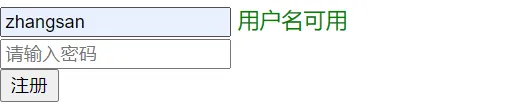 需求:实现用户名校验,如下图所示,当用户名在数据库中存在就提示注册过了,请换一个,没有的话,提示用户名可用