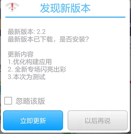 UmengUpdateAgent.forceUpdate(MainActivity.this); 这行很重要,不加上这条,看看界面如何:这里可以选择忽略改版,然后即使代码规定点击以后再说,也不会退出应用程序。 反过来加上这句代码看看界面如何:
