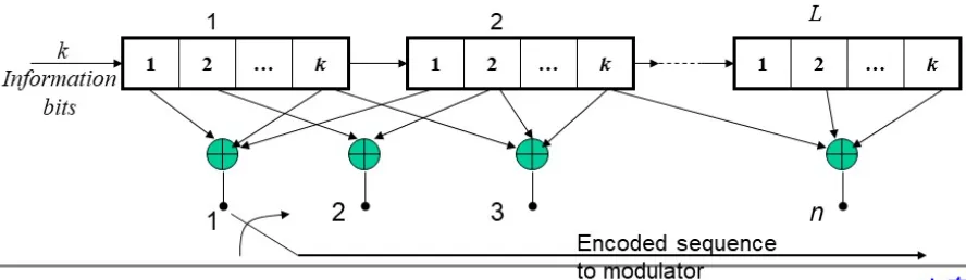 (n, k, L) 卷积码: 下图为卷积码的编码器, 其中有 kL 级 移位寄存器, $\boldsymbol{L}$ 称为卷积码的约束长度。