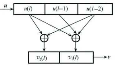 卷积码不同于分组码的一个重要特征就是编码器的记忆性,即卷积编码过程产生的n元组,不仅是当前输入k元组的函数,而且还是前面L-1个输入k元组的函数。通常,n和k取较小的值,通过L的变化来控制编码的能力和复杂度。