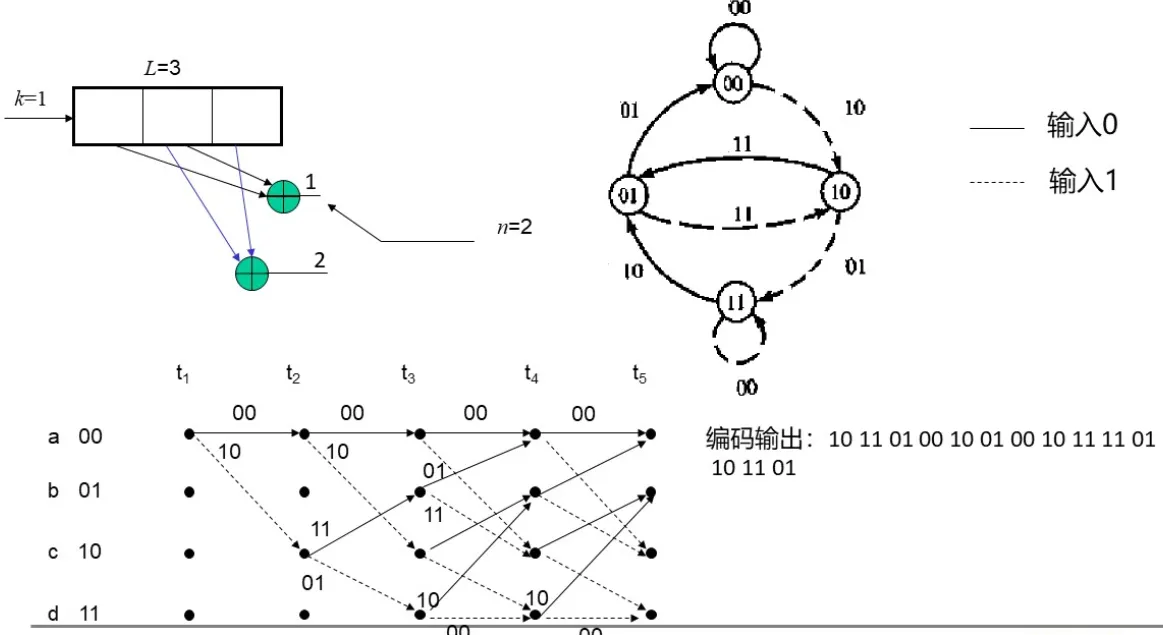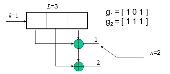 卷积码由三个整数描述, (n, k, L), 其中k/n也表示编码效率,L称为约束长度; 表示在编码移位寄存器中k元组的级数,k表示编码时一次输入编码器的码元数。