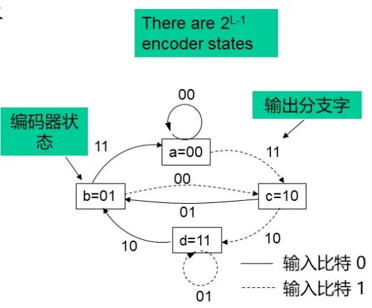 状态图方框内的状态表示寄存器最右端(L-1)级的可能内容,状态间的路径表示由此状态转移是的输出分支字。寄存器的状态表示为a=00,b=01,c=10,d=11.对应于两种可能的输入比特,从每一个状态出发只有两种转移,状态转移时的输出分支字标注在相应的转移路径旁。图中实线表示输入比特为0的路径,虚线表示输入比特为1的路径。