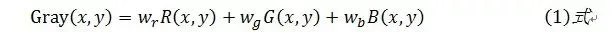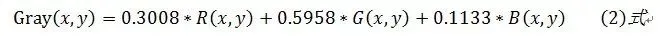 根据YUV颜色空间和RGB颜色空间的转换关系,确定各权值分别为0.3008、0.5958、0.1133时,简化公式如下: