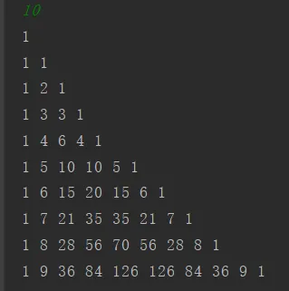 条条大路通罗马,两种方法都可以打出杨辉三角,第一种是常见的,第二种就更需要一定数学知识了,相比第一种,个人更倾向于后者,毕竟,要学好编程,数学思维是必不可少的。