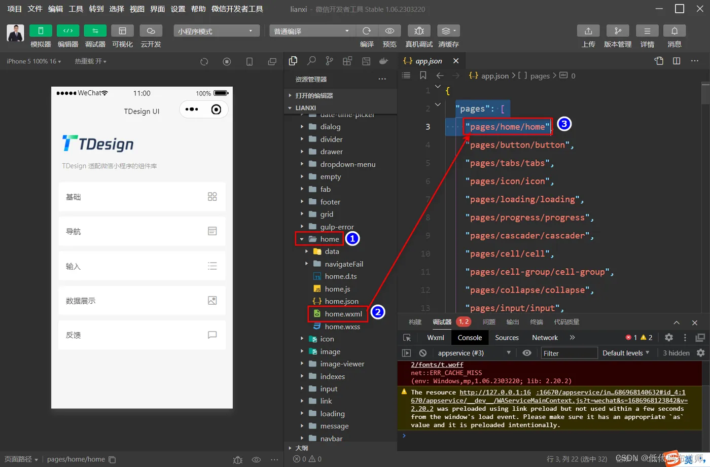 首先我们的页面都是放在pages文件夹里,然后第二层是我们的home文件夹,第三层home是我们的home.wxml