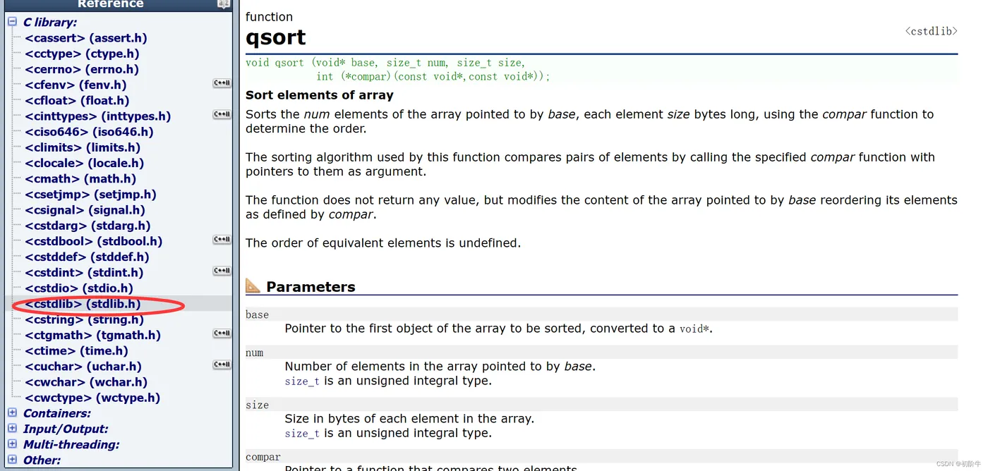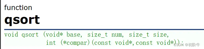 | 参数4 ( int (compar)(const void,const void*)) | 指向数组中元素比较方式的函数指针 |