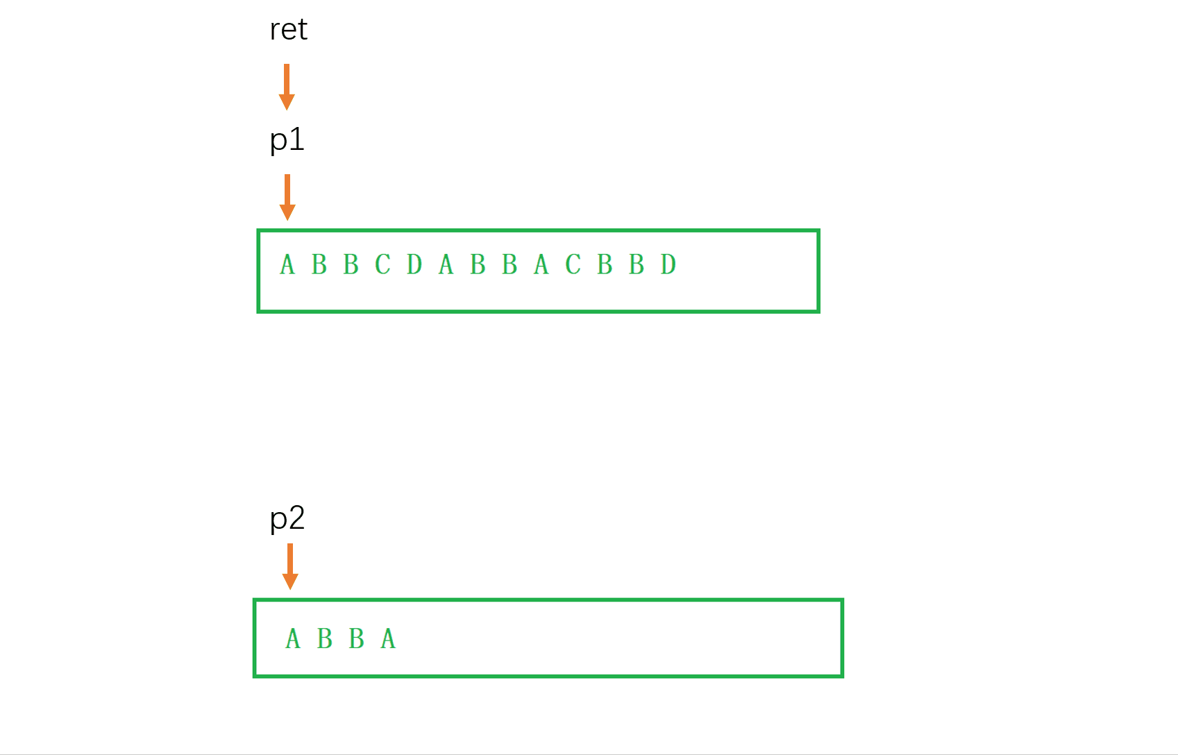 - p1退回到ret位置,p2回到初始位置,重新比较.