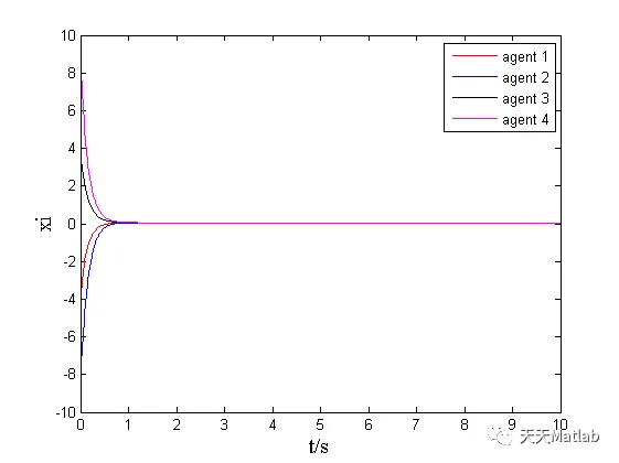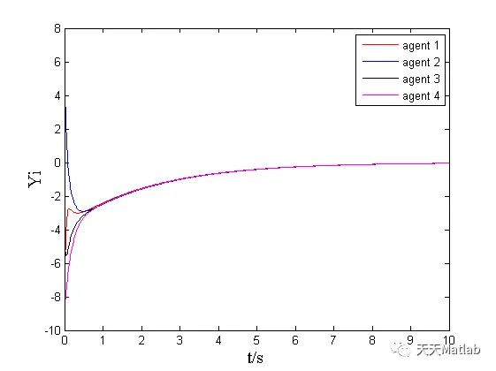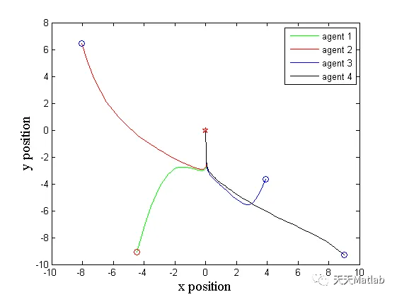 clcclearclose allt0=0;tf=10;step_qw=0.01;p1=10;q0=[(rand(1)-0.5)*p1;(rand(1)-0.5)*p1;(rand(1)-0.5)*p1;(rand(1)-0.5)*p1;(rand(1)-0.5)*p1;(rand(1)-0.5)*p1;(rand(1)-0.5)*p1;(rand(1)-0.5)*p1 ];load('q0.mat','q0'); %save('q0.mat','q0');[t,q]=ode45('Whole_Twodimension_total_state',t0:step_qw:tf,q0);figure(1);hold onxlabel('x position','FontName','Times New Roman','FontSize',14);ylabel('y position','FontName','Times New Roman','FontSize',14);plot(q(:,1),q(:,2),'g');hold onplot(q(:,3),q(:,4),'r');hold onplot(q(:,5),q(:,6),'b');hold onplot(q(:,7),q(:,8),'k');hold onlegend('agent 1','agent 2','agent 3','agent 4');%plot(q(:,9),q(:,10),'c');%hold onplot(q(1,1),q(1,2),'ro');hold onplot(q(1,3),q(1,4),'bo');hold onplot(q(1,5),q(1,6),'bo');hold onplot(q(1,7),q(1,8),'bo');hold on%plot(q(1,9),q(1,10),'bo');%hold onplot(q(end,1),q(end,2),'rp');hold onbox onfigure(2)hold onxlabel('t/s','FontName','Times New Roman','FontSize',14);ylabel('xi','interpreter','latex','fontsize',14);hold onplot(t,q(:,1),'r-');hold onplot(t,q(:,3),'b-');hold on;plot(t,q(:,5),'k-');hold on;plot(t,q(:,7),'m-');hold onlegend('agent 1','agent 2','agent 3','agent 4');box onfigure(3)hold onxlabel('t/s','FontName','Times New Roman','FontSize',14);ylabel('Yi','interpreter','latex','fontsize',14);hold onplot(t,q(:,2),'r-');hold onplot(t,q(:,4),'b-');hold on;plot(t,q(:,6),'k-');hold on;plot(t,q(:,8),'m-');hold onlegend('agent 1','agent 2','agent 3','agent 4');box ongrid off